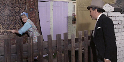 Next door to Burt is Horace Quilby (Bentine) pigeon fancier and sandwich man employed, for those of you from the 21st Century, to walk the streets of central London advertising services on cardboard signs slung over his shoulders, in this case Finklebaum & O’Casey Gents Bespoke Overcoats & West End Suits. His neighbour is played by the legendary Dora O’Brien, who takes a break from beating her carpet to inquire about his racing pigeon, Esmerelda, who is involved in a major race from Bordeaux to London. There’s a frisson between the two… the promise of more just as Horace’s feathered friend might bring him greater success in the sporting world of Columba livia domestica.